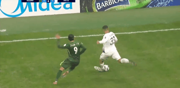 42' Zhang Yuning foi humilhado pelo adversário driblar sob sua virilha, Fábio empurrou o adversário para sua companheiros