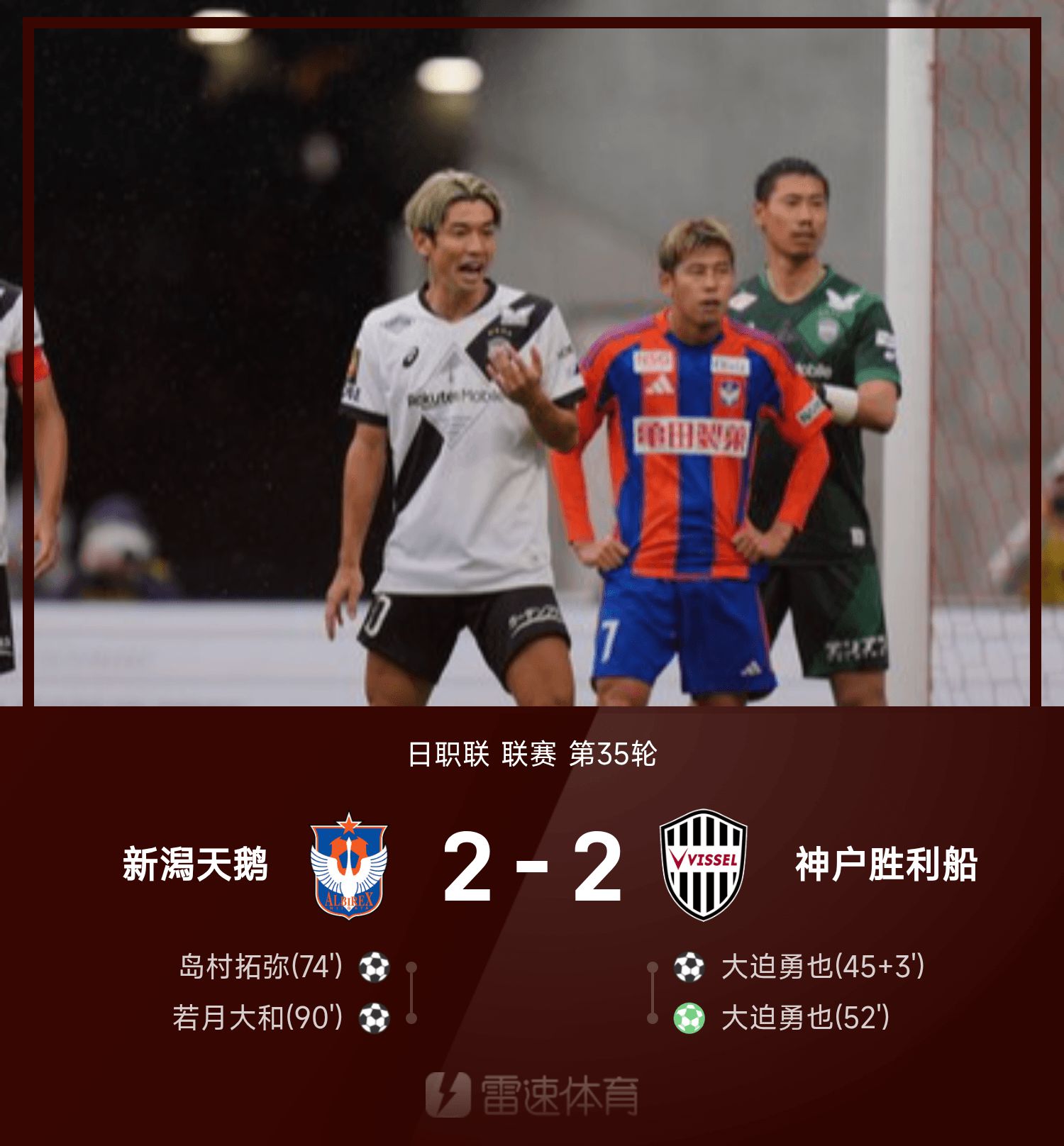 6686 Sports 26 de outubro Na 35ª rodada da 25ª Liga Profissional do Japão, o Niigata Swans empatou em 2 a 2 com Kobe e venceu a partida. No final do primeiro tempo, Isamu Osako marcou de cabeça. Pouco depois do início do segundo tempo, Isamu Osako marcou de pênalti para ampliar a vantagem. Aos 74 minutos, Shimamura Takuya marcou de voleio para trazer o jogo de volta. No último momento, Wakazuki Yamato contra-atacou e ajudou Niigata a empatar com Kobe.
