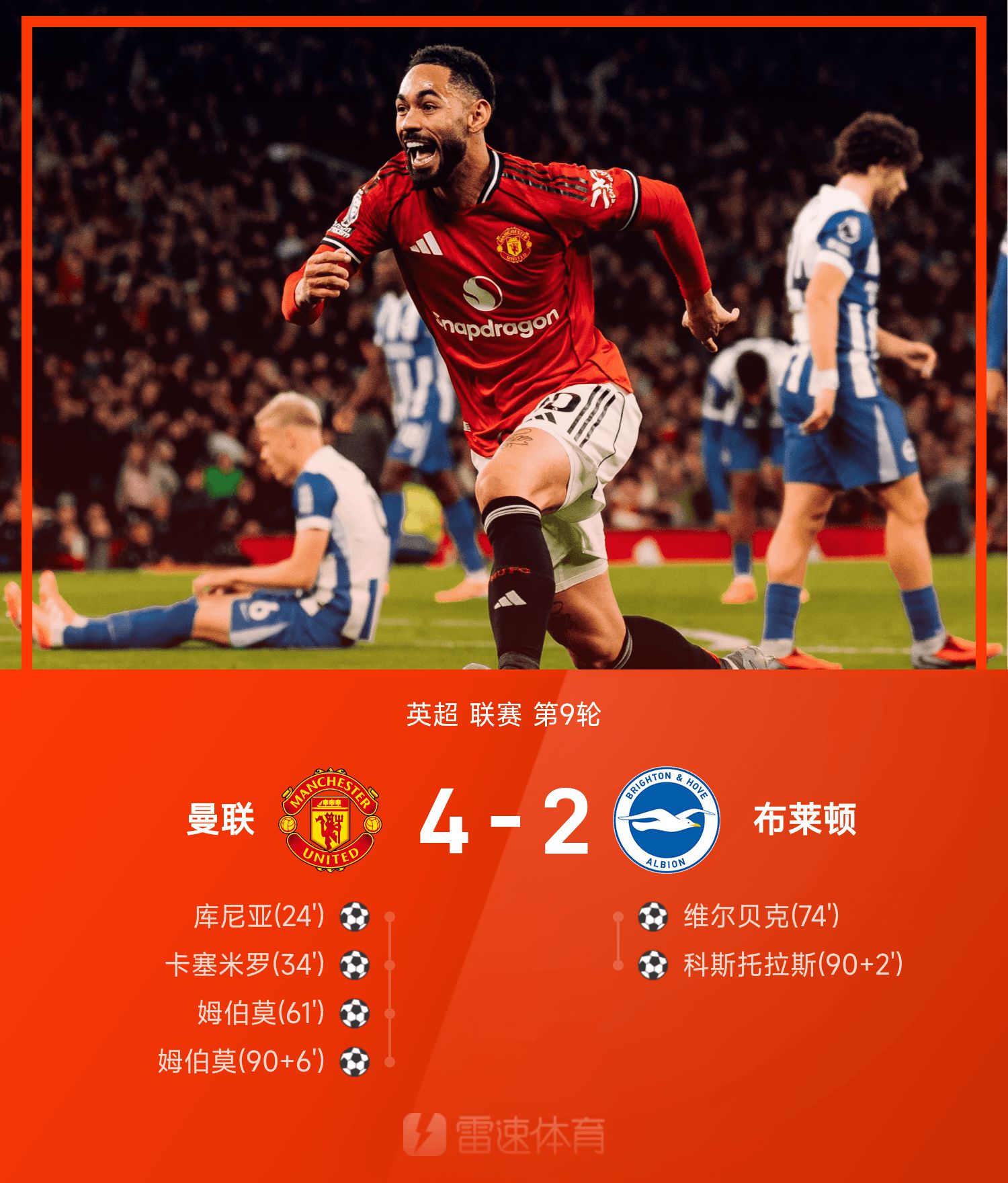 6686 Sports 26 de outubro Na nona rodada da temporada 25/26 da Premier League, o Manchester United enfrentou o Brighton em casa. As duas equipes trocaram ataque e defesa na etapa inicial, e o impasse foi desfeito logo no minuto. Casemiro marcou e Cunha marcou seu primeiro gol desde que ingressou no Manchester United com um chute de fora da área de três segundos. Aos 10 minutos, o chute externo de Casemiro foi desviado para a rede pelo zagueiro, e o Manchester United entrou no intervalo com vantagem de 2 a 0.