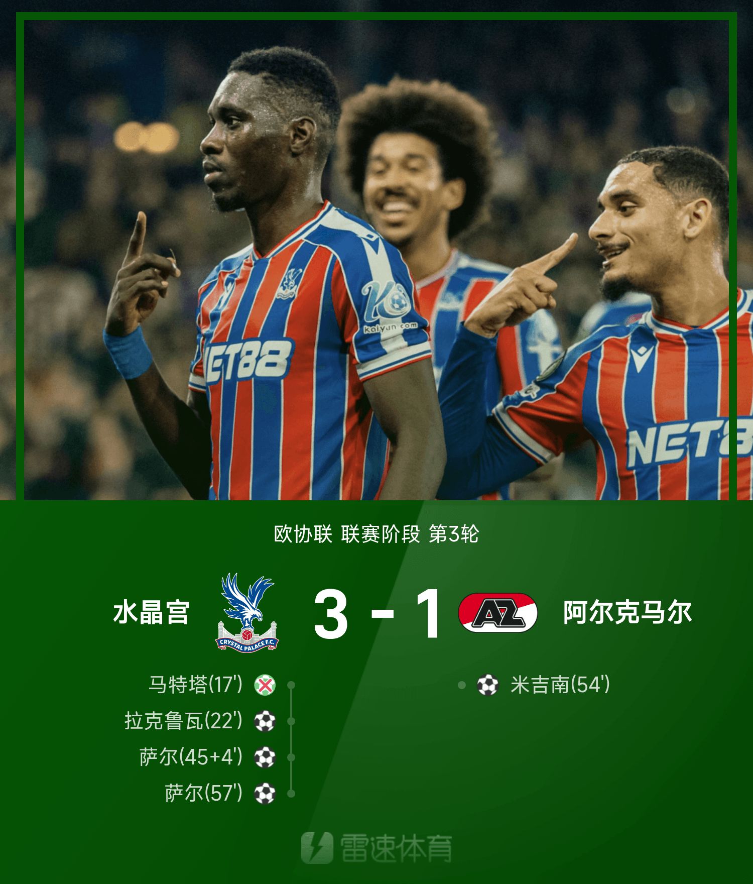 6686 Sports News em 7 de novembro Na terceira rodada da Liga dos Campeões da UEFA 25/26, o Crystal Palace derrotou o Alkmaar por 3-1. Em todo o jogo, Sarr marcou duas vezes, Lacroix marcou um gol, Miginan marcou mas não conseguiu salvar o goleiro, Mateta errou um ponto, Oduro salvou o ponto após mandar o ponto e contribuiu com 4 defesas em um único jogo.