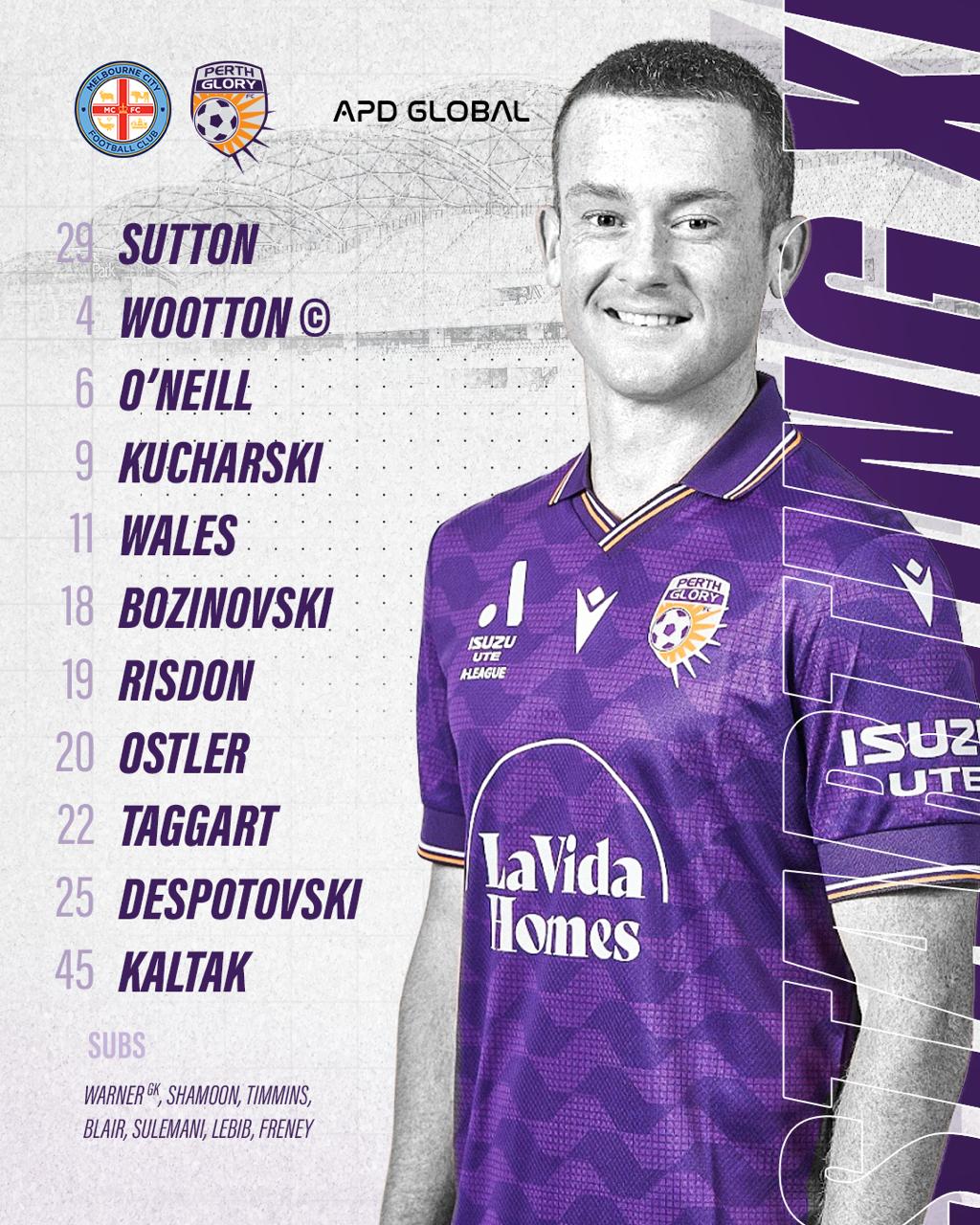 Escalação inicial do Perth Glory: 29-Sutton, 19-Risden, 4-Wooton, 11-Wells, 45-Karl Tucker, 20-Osterler, 6-O'Neill, 9-Kuchalski, 18-Boznovsky, 2 5-Despotovsky, 22-Taggart